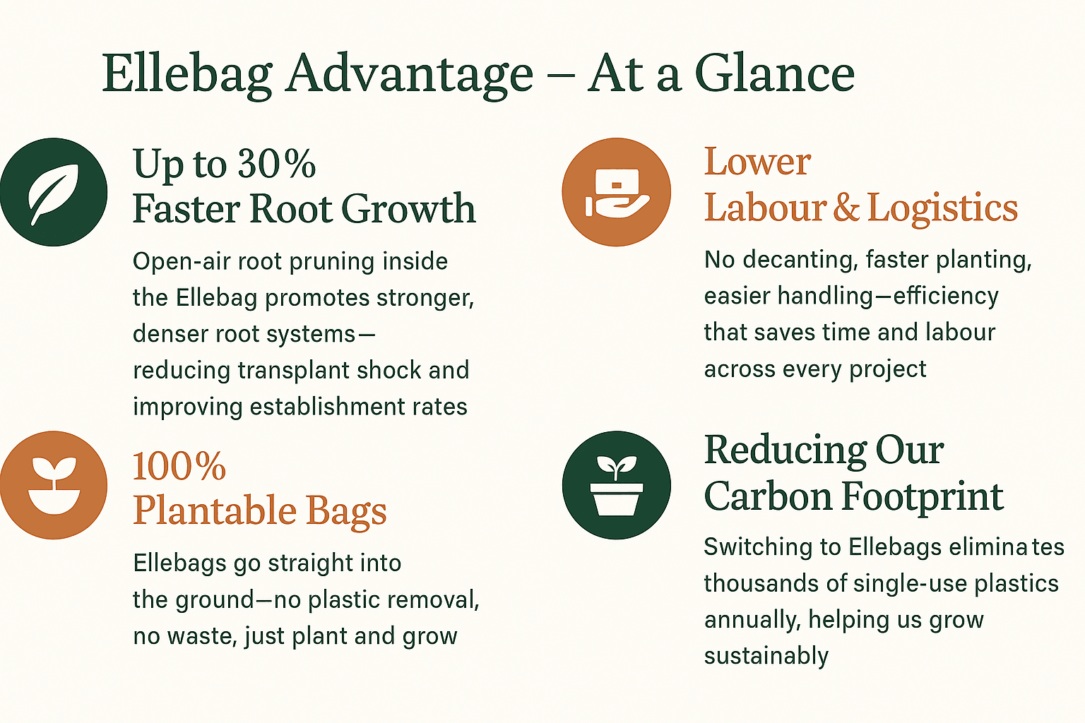 The ease of use when working with the Ellebag has meant we save time in our planting process and never need to worry anymore about disposing of plastic trays/pots/bags anymore.